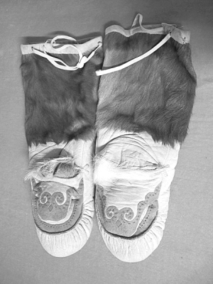 现收藏于民族文化宫博物馆的这副狍皮手套,是鄂伦春族冬季狩猎时必备的传统服饰之一。该手套拇指与四指分开,四指部分连成一体。手套通长48厘米、宽13厘米,套口处穿有一根可收缩的白色带子。手腕处到套口是外翻毛皮,长21厘米。手心外翻皮毛长近5厘米,拇指和掌边及四指前部用染色小块兽皮剪裁成云卷蝴蝶纹进行补绣,红、绿线缝皮边,云纹中间有一棱形蓝色布装饰。该手套选料精良、样式古朴,是狍皮手套的精品,体现了鄂伦春族独一无二的游猎文化。