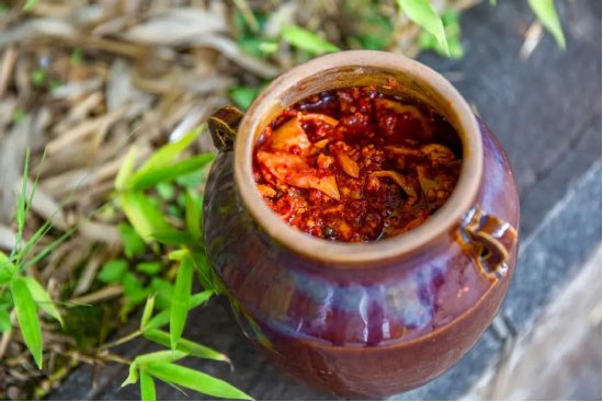 关于鹤庆的滋味,最深刻的记忆还要数那一小碟红亮鲜香的猪肝胙。猪肝胙是用新鲜的内脏、排骨佐以食盐、花椒、辣椒、八角、草果等众多香辛料研制而成的鹤庆特色美食。腌制好的猪肝胙,开坛即可闻到浓重的香气扑鼻而来,蒸熟下饭,炒菜提鲜,猪肝胙浓郁的滋味都不会令人失望。