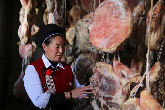 鹤庆火腿的美名,在滇西广为传颂。鹤庆火腿,又称“圆腿”或是“盘腿”,取自其圆整的外形。制作鹤庆火腿,要精选皮薄肉嫩的后腿,经过晾透、扎孔、喷酒、撒盐,反复的摩擦之后,腌制阴干,鹤庆火腿滋味鲜美,咸香不腻,蒸制,煸炒,亦或是加在其他菜肴中增香提味,都是上佳选择。