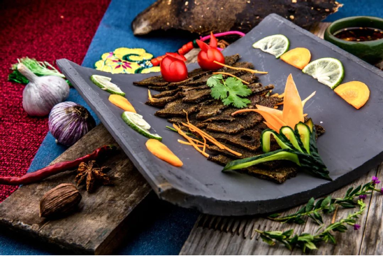 若论独特,鹤庆吹肝不管是在视觉还是味觉上,都是与众不同的存在。新鲜猪肝,要吹到鼓起膨胀之后,把事先准备好的辣椒面、花椒面、切细的香葱,和酒一起往猪肝气孔通道里填塞,在外面涂上一些精盐,最后挂在屋檐下,经过时间的历练方可成型。切成薄片的吹肝,细密的气孔能够迅速吸满蘸汁的风味,独特的口感可谓一绝。
