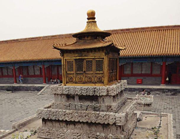 大高玄殿乾坤亭,始建于明嘉靖二十一年(1542年),名无上阁,清代乾隆朝改名乾元阁。明代时供奉嘉靖皇帝玄修像(称象一帝君)。此亭为木构建筑,上层为圆攒尖宝顶,下层为方形,上下层之间有一层圆形平座层。
