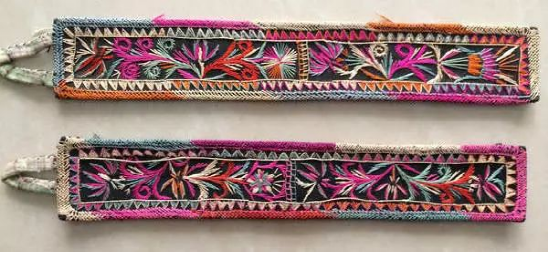 ▲腰巾绣花带,刺绣纹样植物纹、几何纹居多,基本都是黑底彩绣,色彩稳重大方。