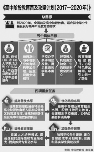 据中国民族报讯  2017年4月6日,教育部公布《高中阶段教育普及攻坚计划(2017-2020年)》(以下简称《攻坚计划》)。《攻坚计划》提出,到2020年,全国普及高中阶段教育。我国高中阶段教育毛入学率将要达到90%。