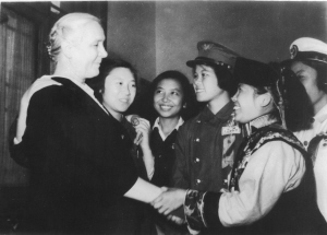 1955年9月苏联卓娅和舒拉的妈妈(左一)访问中国时接见中国的“瓦尔瓦娜”(苏联电影《乡村女教师》女主角)、全国青年社会主义建设积极分子阿角(右一),时有郝建秀(左三)、徐建春(左二)同志在场。 资料图片