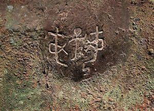 妇好墓出土的“‘好’连体铜甗”内壁上的铭文。新华社记者李安摄